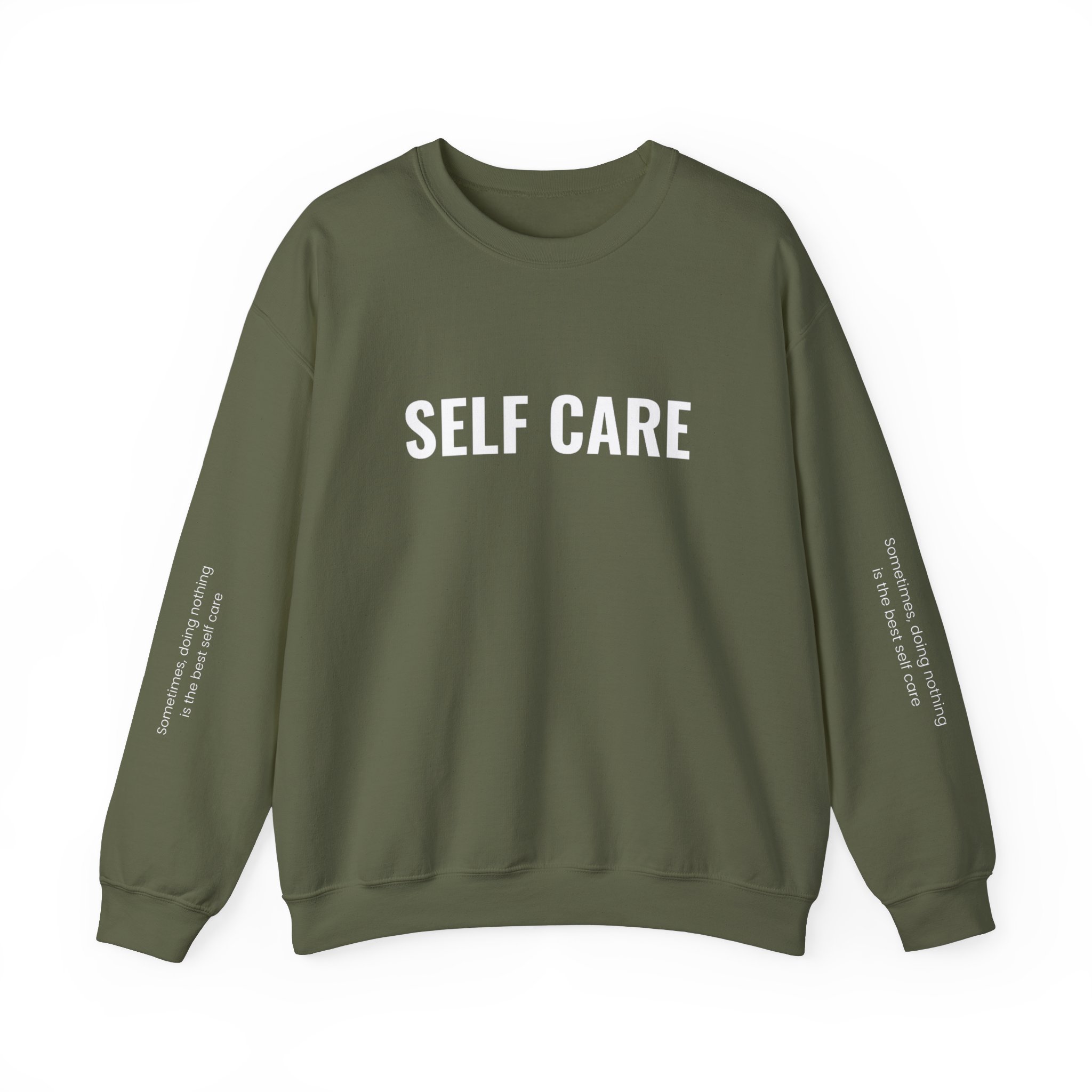 Wrap yourself in comfort and a powerful reminder with our “Self-Care” sweatshirt. Featuring the word “Self-Care” on the front and the inspiring quote “Sometimes, doing nothing is the best self-care” elegantly displayed on both sleeves, this stylish sweatshirt blends motivation with modern fashion. Crafted from premium-quality materials, it offers a cozy fit perfect for all-day wear. Whether lounging at home or heading out, this versatile clothing piece ensures you look and feel your best. Plus, enjoy the added benefit of free shipping! Embrace self-care and elevate your wardrobe with this comfortable sweatshirt today.